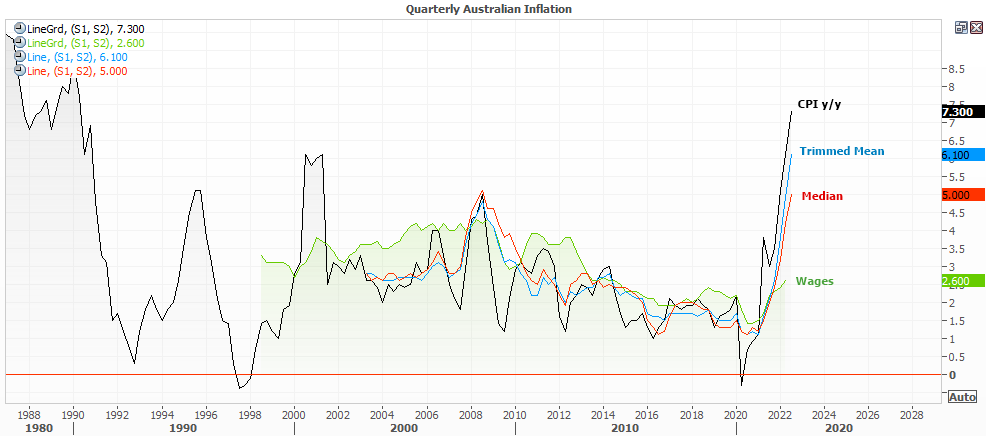 澳大利亚CPI同比增长7.3%,超过预测的7%,远高于第二季度的6.1%。澳联储即将采取哪些措施遏制通胀备受关注,CPI截尾均值同比上涨6.1%(预期为5.6%),加权平均同比增加5%(预期4.8%)。最新发布的月度通胀数据年率上升至7.3%,创下该系列数据2018年10月首发以来的新高。此外,核心CPI连续五个季度打破中期经济预测。总而言之,通胀火热。