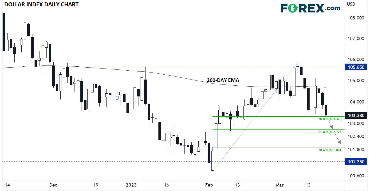 截至撰写本文时,美元正在测试一个多月来的最低点位103.00附近,而几周前还在105.00附近逼近年内高点。中期趋势继续看跌,因此,如果鲍威尔主席和同僚不加息,美元接下来将迅速跌至102.70(今年反弹的61.8%斐波那契回撤位)或101.90(78.6%斐波那契回撤位)。